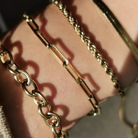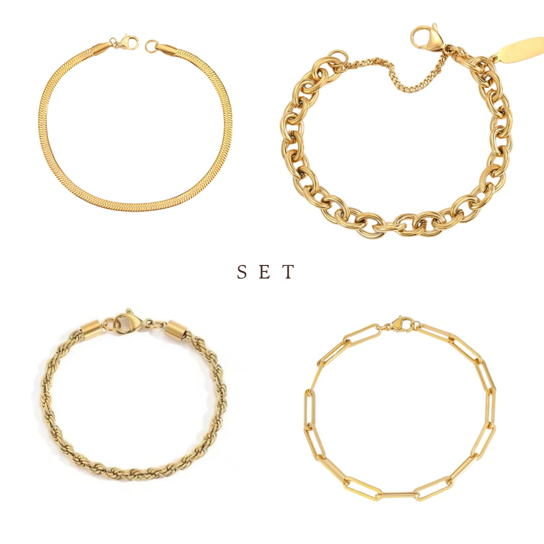 Vergoldetes Armband Set – vier Designs, ein Statement. Dieses Set vereint vier verschiedene vergoldete Edelstahl-Armbänder in einem harmonischen Mix: von filigran bis markant. Trage sie einzeln für schlichte Eleganz oder im Layering-Look für maximale Wirkung.